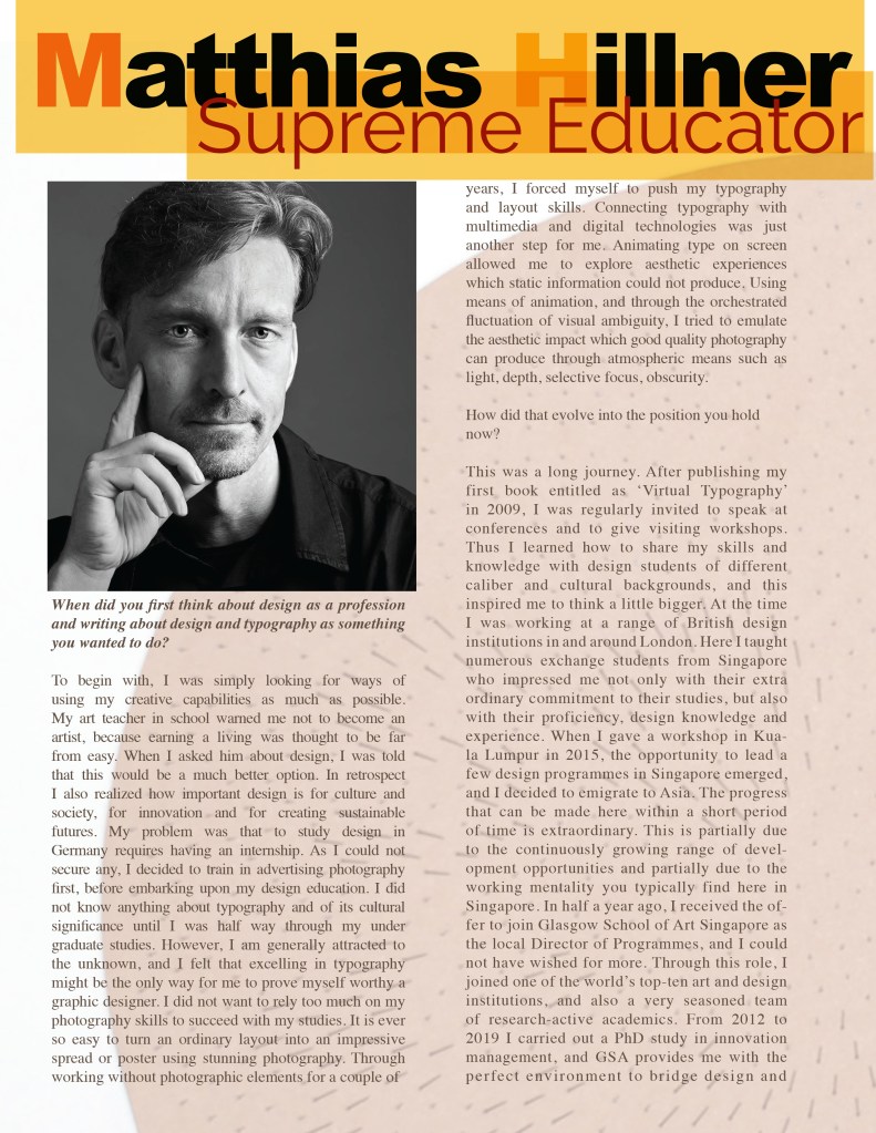 I have engaged in art, design and innovation for over thirty years and I hold three postgraduate degrees from the Royal College of Art, London, including a PhD in Design IP and Innovation Management. In 2015 I was commissioned by the UK IPO to investigate the infringement of design rights in the UK before I moved to Singapore to become Head of School, Design Communication at LASALLE College of the Arts. I have spoken at numerous international design and innovation conferences and I served as Director of Programmes at the Glasgow School of Art in Singapore for three years until 2021. In 2005 I secured a start-up award obtained from the National Endowment of Science Technology and the Arts (NESTA) which allowed me to start my design consultancy Studio for Virtual Typography. Since moving to Singapore my emphasis has shifted to IP, innovation management, and design entrepreneurship. I am currently Professor at SCADpro at the Savannah College of Art and Design.