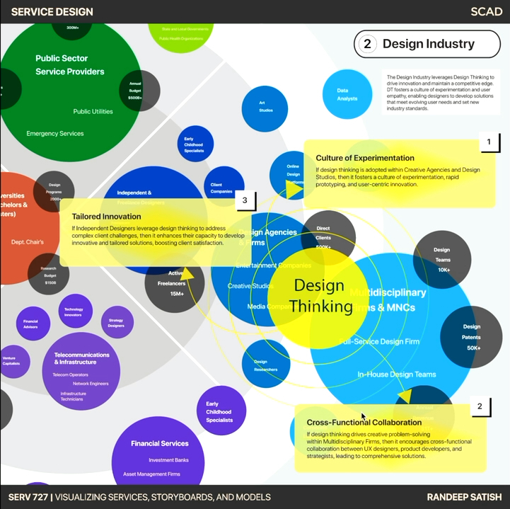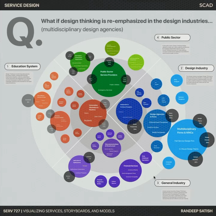The work shown here stems from a service visualisation class which I developed and delivered in exchange with MA design students at SCAD. Instead of focusing on the common service system scenarios to explore methods such as experience journey mapping, stakeholder analysis, and ecosystem mapping, we applied these techniques at a larger scale to investigate historic paradigm shifts in design, aviation, healthcare, education, etc.