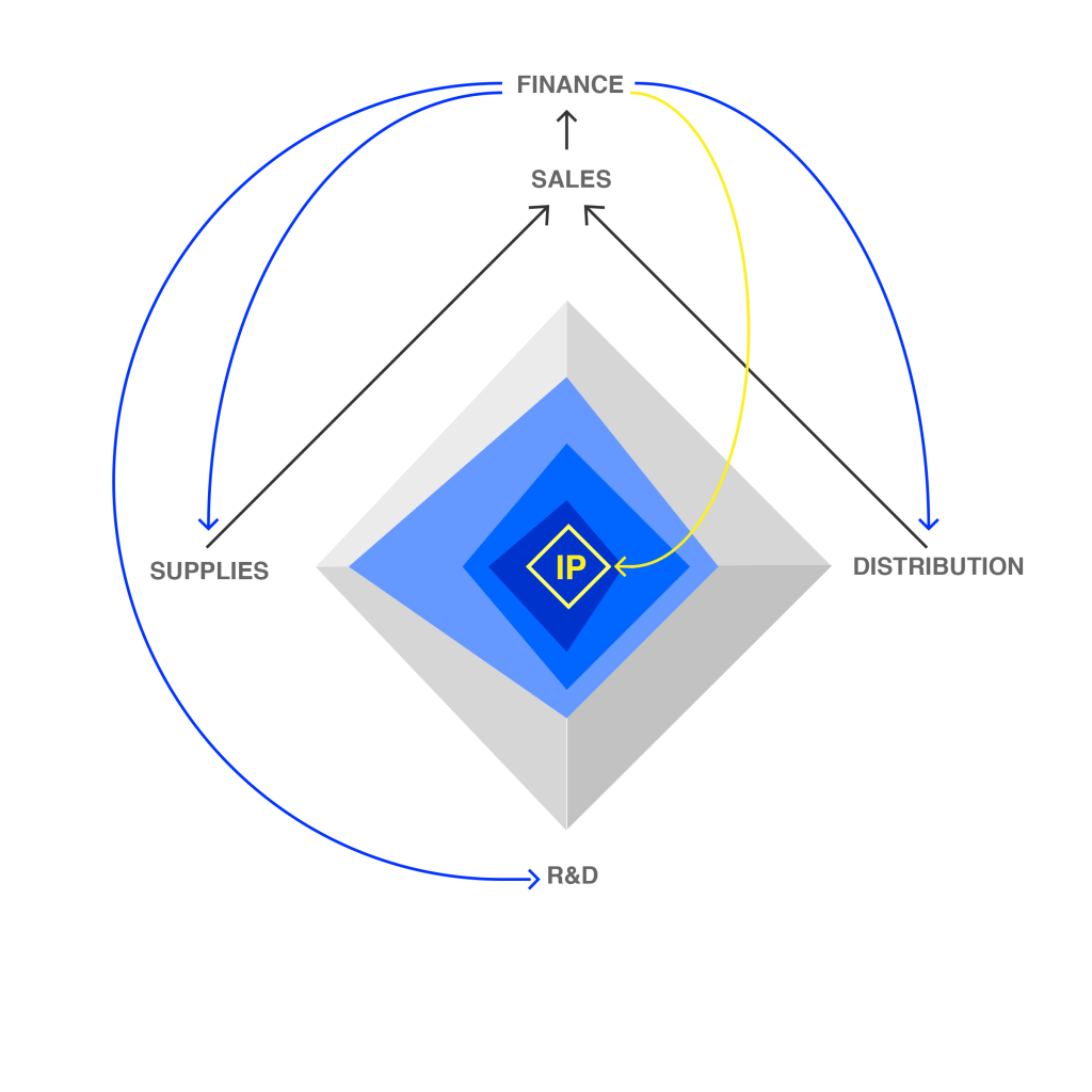 The Business Development Diamond lends itself to monitoring progress made in relation to securing the necessary supplies, and distribution options. Sales grow progressively as inventive steps are further developed and new once are discovered (R&D). This model can show if you are pursuing a tech-push or a market pull initiative, and if your supply chain and your distribution networks are developing in a balanced fashion.