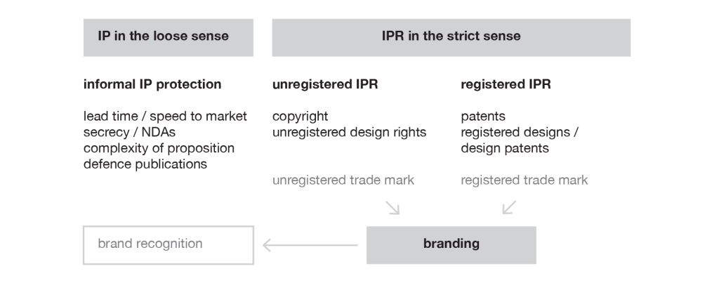 Forms of IP: this simple diagram provides a rough overview over the most significant forms of knowledge protection. It is important to understand the significance of informal protection methods to be able to build a robust IP protection strategy.